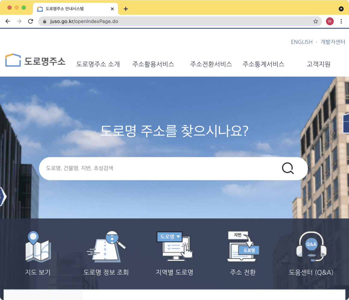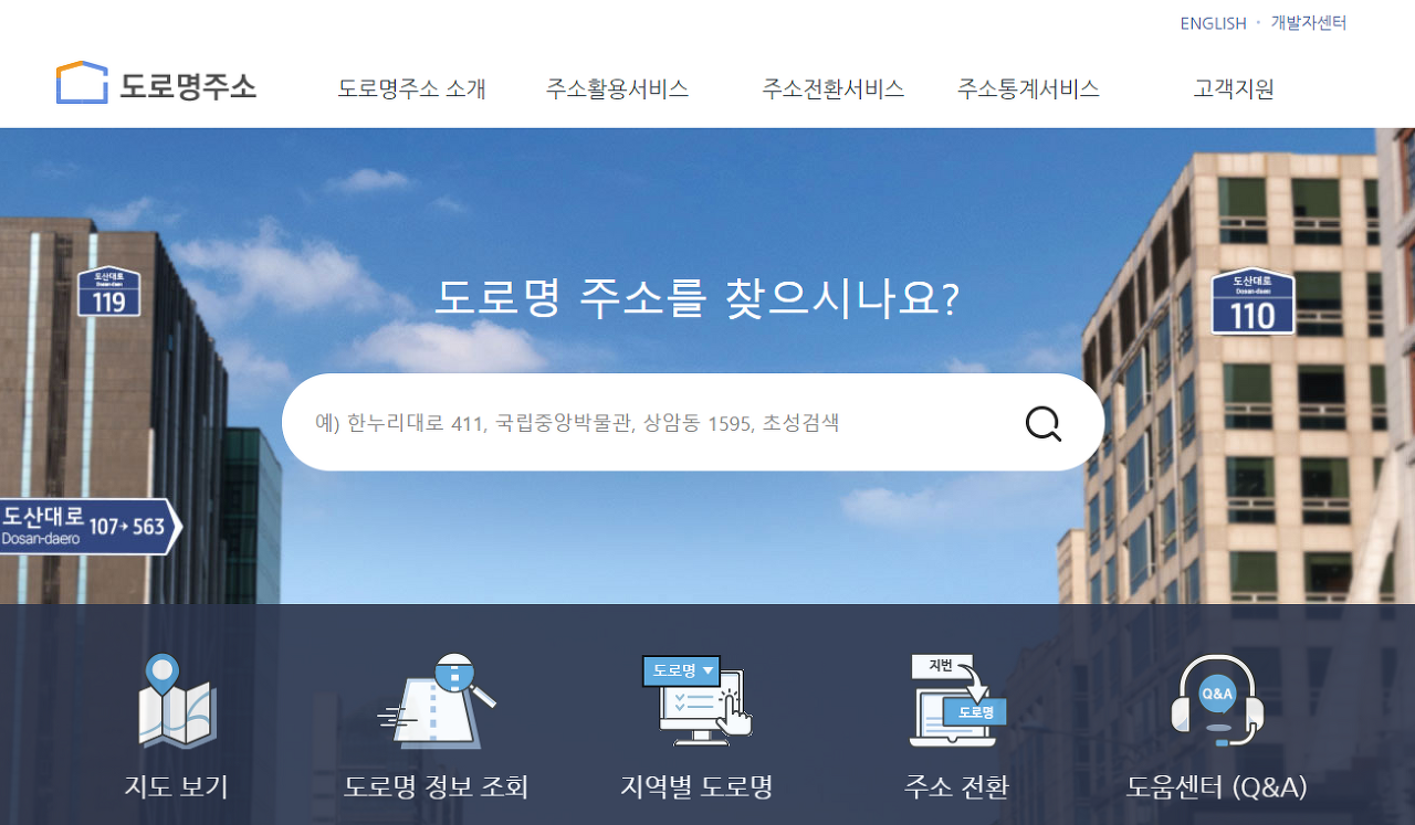 국문 도로명 주소를 영문으로 변형하는 방법은 아주 간단합니다. 우선 주소정보누리집이라 하는 사이트를 이용하는 방법이고요. 주소정보누리집(도로명주소 안내시스템) 사이트에 들어가면 메인 페이지에 다음과 정연히도로명 주소를 검색하는 검색창이 나와요. 이곳에 찾고자 하는 주소를 입력해주세요.