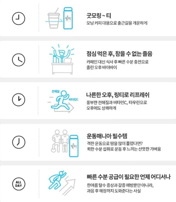 군의관들이 장병들이 탈수하는 모습을 보며 형성하게 되었다는 만큼, 링티의 주요 효능은 수분보충이예요. 예사로 누구라도몸몸에 수분이 결여되면 집중력이 떨어지고 피로감, 두통 등의 증상이 나타나게 되었는데데 일반적인 물에 비교하면몸 속 흡수율이 높은 편이예요.