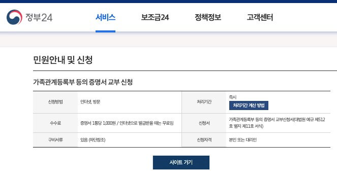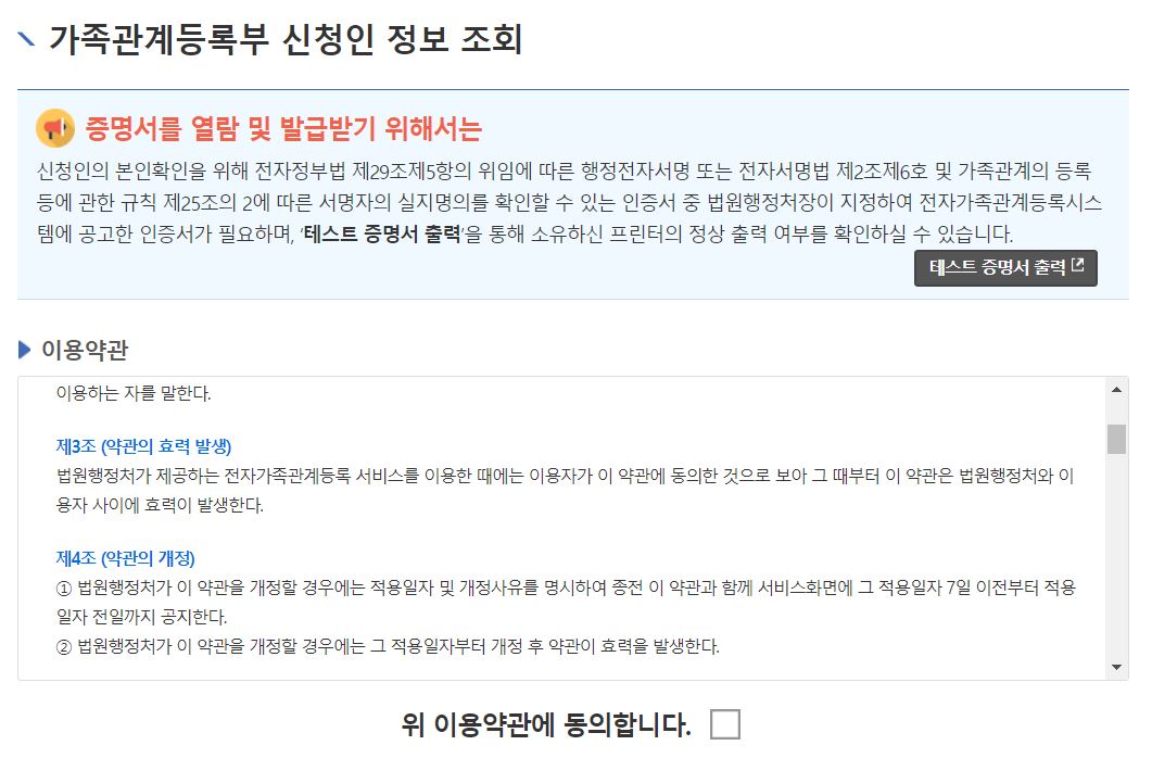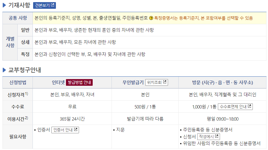 가족관계증명서는 무인발급기 이용이 최대한도이데요. 정부 24나 대법원 전자가족관계 홈페이지에서 무인발급기 위치를 검색할 수 있기도하고 신청은 본인만 가능해요. 수수료는 1통에 500원이며 이용시간은 발급기에 따라 다르죠. 그리고 무인발급기 이용 시 본인 인증을 위한 지문이 필요합니다.