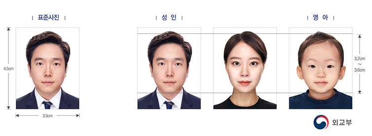인물과 배경에 그림자나 빛 반사가 있으면 안 되고 얼굴 방향과 표정도 중요해요. 모자를 쓰거나 스카프 등으로 얼굴을 가려서는 안 되며 24개월 이하 영아의 경우 장난감이나 보호자가 사진에 드러난 사진을 여권사진으로 쓸 수 없다고 합니다.
