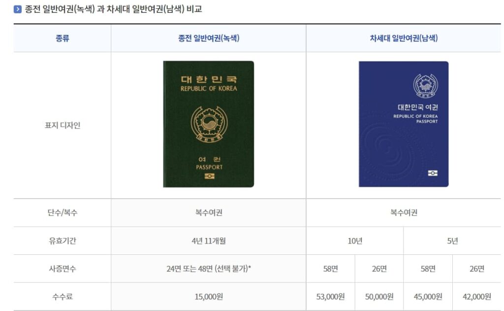 소상하게 확인하면 5년 동안 사용할 수 있는 여권은 42,000원에서 45,000원이며 10년 기간의 여권은 50,000원~53,000원이고요. 여권의 면수와 나이에 그렇기에도 수수료가 다르니 정화한 수수료는 아래 표로 체크하시면 돼요. 표를 보시면 5년짜리 여권과 10년짜리 여권의 수수료 차이가 크지 않아서 10년짜리로 발급받으시는 것이 경제적이라고 합니다.