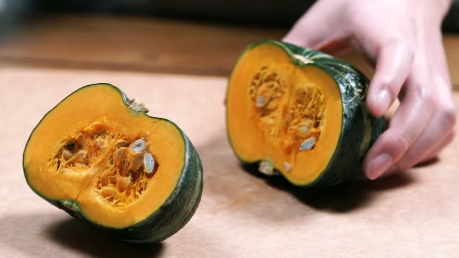 다음으로 약해진 단호박을 반으로 잘라 과육이 손실되지 않게 씨를 걸러주어야 하더라고요. 이과 동시에 함께 단호박은 열처리가 진행되지 않다면 단단해서 손질이 쉽지 않고, 풋내가 날 수 있다는 단점을 지참하였으있고요.
